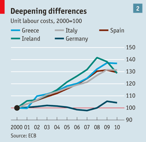 Veja a diferencia entre os custos de trabalho por unidade (unit labour costs) entre os países da periferia e a Alemanha e faz a sua conclusão sobre o nivel da competitividade como a sua consequencia.